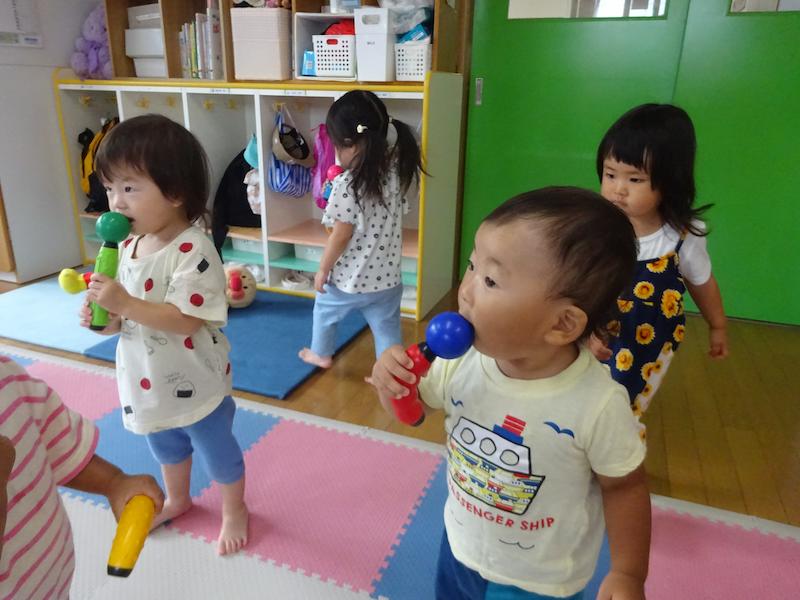 1才児クラスでは、まだまだ会話が難しい時期ですが、どんどん単語が話せるようになり驚きの日々です。おもちゃがマイクに変身する事もあります。マイクを持つとインタビューに答えてくれます。子ども達との謎の会話はほのぼの感がいっぱいになり、癒しの時間となります。