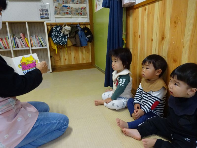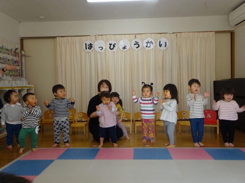 最近は、二人で手をつないでするリズムや歌遊びを楽しめるようになってきました。音楽が聞こえてくるとニヤニヤしながらお友だちを探して手を繋いでいます。全員での写真としてはっぴょうかいごっこの総練習の写真でクラス紹介しますね。冬の寒さを感じるようになりましたが、12月も戸外遊びを楽しみながら楽しく過ごし、9人の温もりの中で元気に暖かく過ごしていきましょう!