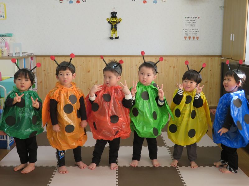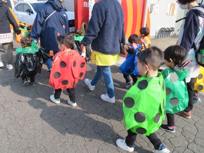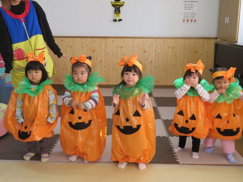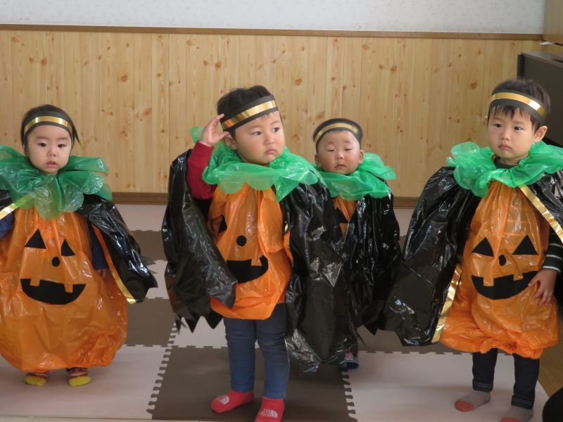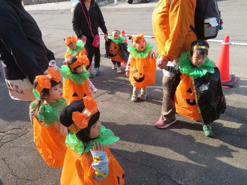 10月31日(金)に青い鳥保育園のハロウィンがありました!すもも組はピカチュウ、ひめりんご組はかぼちゃのオバケ、さくらんぼ組はてんとうむしの仮装をしました!まず全クラスお部屋に集まり、衣装の見せ合いをしましたよ。その後、今年は交流館ではなく近所を練り歩きしました!車を運転している方や近所の方が手を振ってくれ、「かわいいね!!」とたくさん言われる子ども達でした。