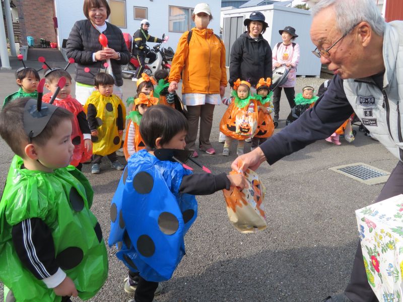事前に依頼していた方々のお家やお店へ行き、「トリックオアトリート!」と大きな声で言ってお菓子を貰いました!お礼に「ハロウィンのうた」をプレゼントし、歌い盛り上がりました。沢山お菓子をもらい、子ども達はとっても嬉しそうでしたよ。