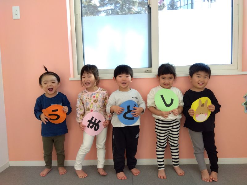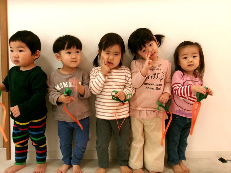 お正月休みが終わり、可愛い笑顔と共にイヤイヤがパワーアップし元気に登園してくれました。「オムツかえよ〜!」と声を掛けると聞こえていないふりをしながら絵本を開いてみたり、ニヤニヤと笑みを浮かべながら「やや〜!」と言ってみたりと着々とイヤイヤ期に突入していますが、自分の意思がはっきりとしてきて可愛い成長だな〜と嬉しさもあります。イヤイヤしながらもお友だちと給食が大好きな子どもたち、吸い込まれるようにくっつき遊ぶときもいたずらするときも常に一緒です。いつの間にかおもちゃの貸し借りも「て!て!(かして)」「とお〜(ありがとう)」と成り立っていて毎日成長中です。