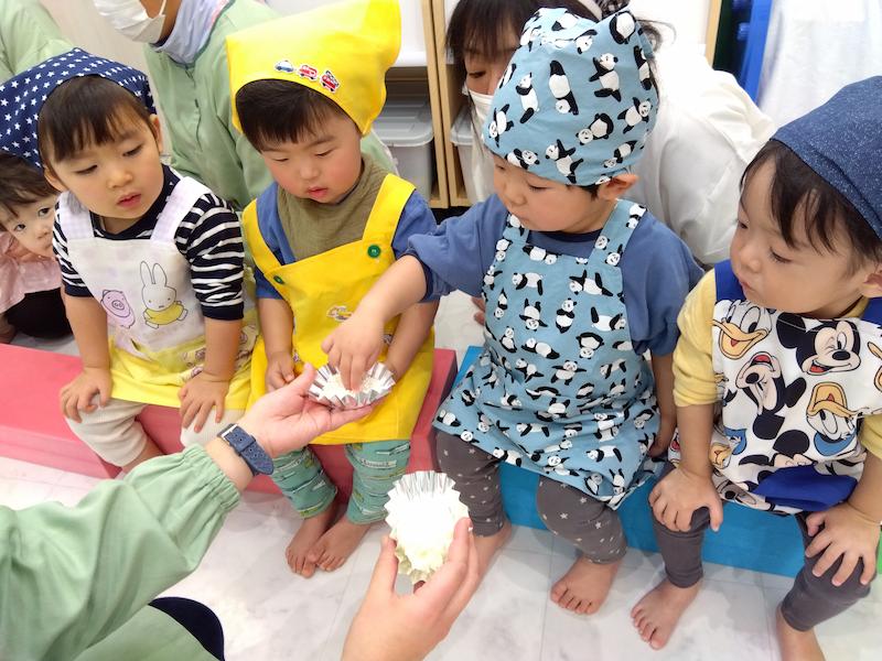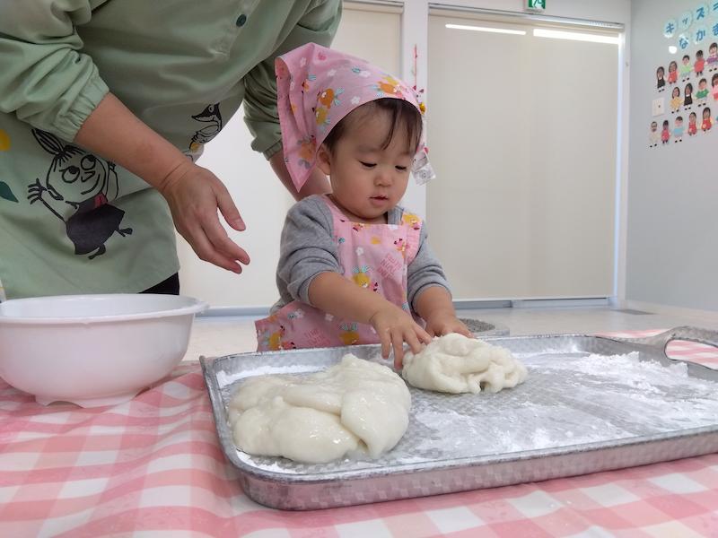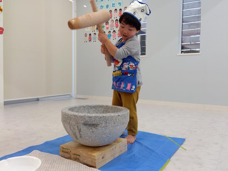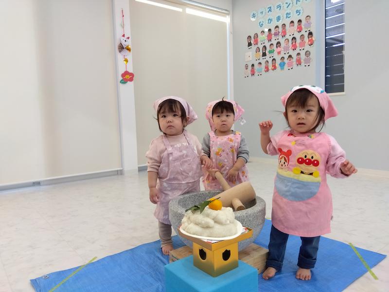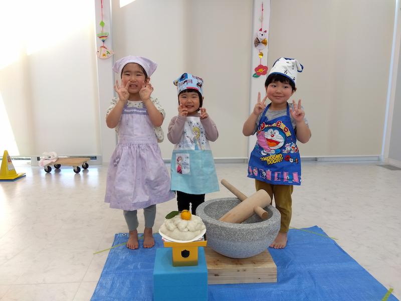 リレーを楽しみ、もちつきの歌をみんなで歌ってから、蒸す前のもち米と、蒸した後のもち米を実際に触りながらみんなで観察…。「かたい!」「つぶつぶしてる」と子ども達も興味津々でした。そしていよいよもちつきがスタート!蒸して柔らかくなったお餅を見て「うわぁ〜!」と歓声も上がりましたよ。一人ずつ杵を持って、10回ずつお餅をつきました。 少し重たい杵でしたが、力強くお餅をつく姿が逞しく見えました!最後に、みんなでお餅をこねて、鏡餅を作りました。作った鏡餅はキッズランドみんなの健やかな一年を願って、玄関に飾りました!