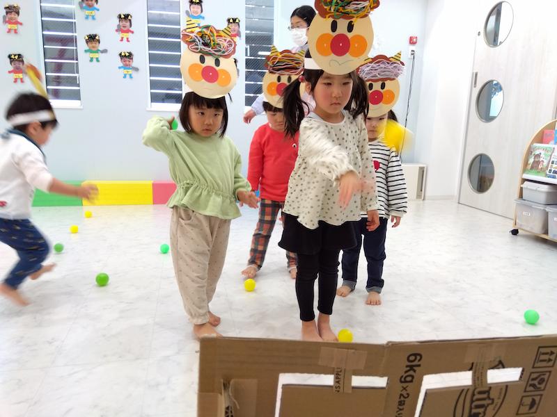 会が始まる前、たいこ組の部屋からは「おには〜そと!」と気合十分な声が聞こえ、 らっぱ組からは盛大な泣き声が響いていました。どうなるのかと心配なスタートでしたが、みんなの好きな玉入れやストラックアウトで遊び、徐々に緊張がほぐれていく子どもたち。真剣な表情でボールを投げ、当たるとニヤっと喜び、どのクラスも夢中になっていましたよ! 今年はみんなで「おにさーん!」と呼ぶと「やっほ〜!」と明るい声の先生鬼が登場!一瞬構えた子どもたちですが、鬼の顔を見たたいこ組からは無言の豪速球が飛び交い、らっぱ組は大人の陰に隠れながらも、力いっぱい投げる姿が見られました。