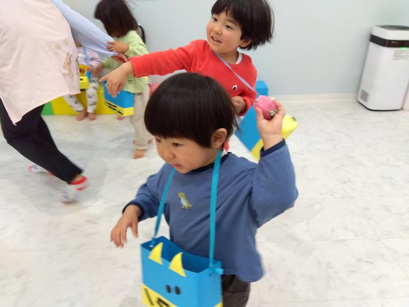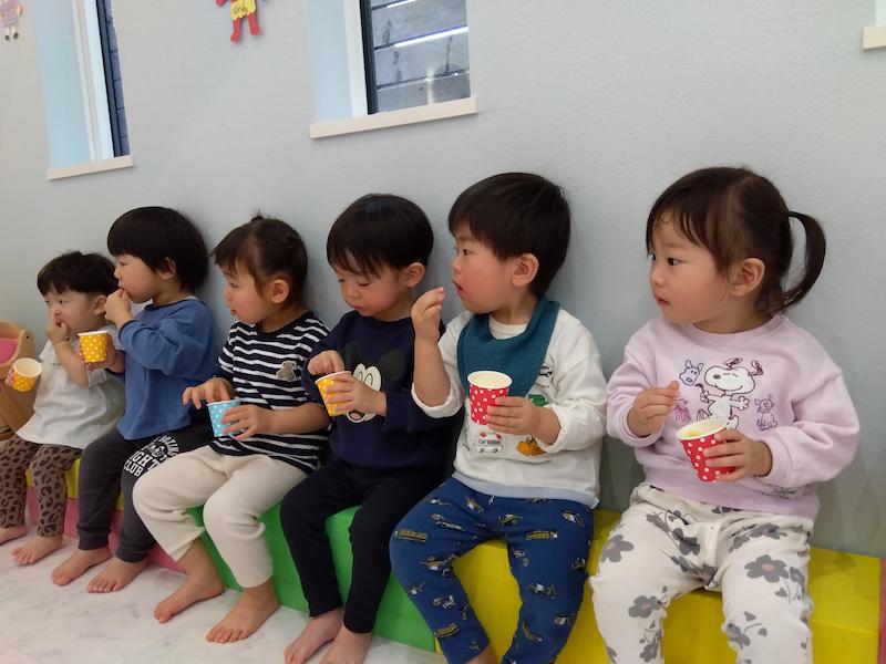 すず組は周りのお友だちの真似をしながら豆ボールを持ち、投げることができました!唯一全員泣かなかったのはすず組だけで、たくましさに驚かされます。無事に鬼退治をし「おいちい!」「○○ちゃんおいしいね〜!」とお友だちと食べる お菓子は格別のようでした!きっとみんなのお腹の中のイヤイヤ鬼、怒りんぼ鬼、泣き虫鬼 も払えた…はず。