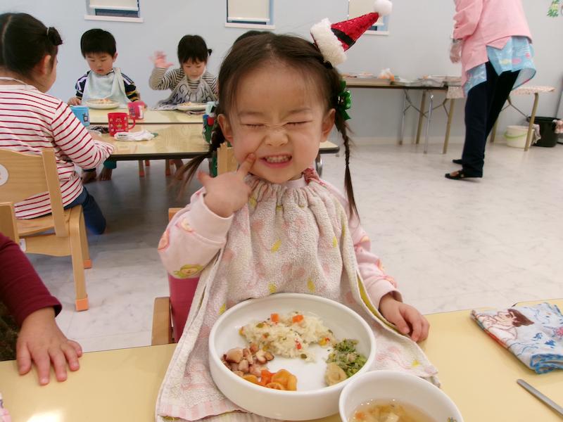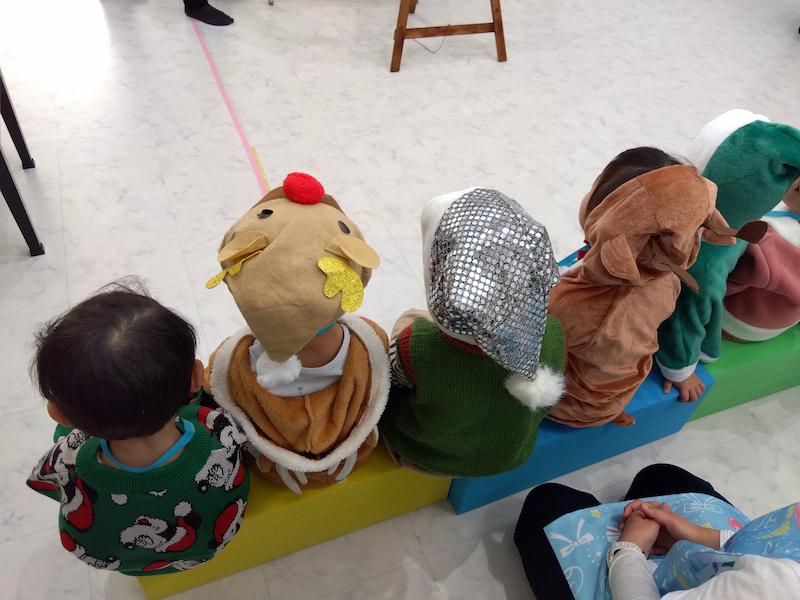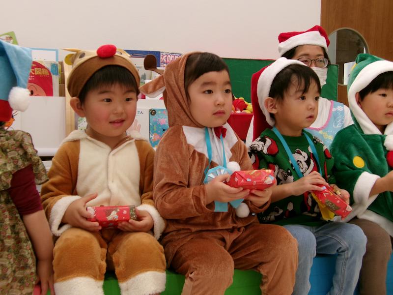 心待ちにしていたサンタさんの登場では、遠くからシャンシャンシャンシャンと鈴の音が聞こえ、大きな袋を持った愉快なサンタさんが現れると固まる子どもたち。突然の登場に驚きながらも、1人ずつプレセントをもらい、たいこ組さんが考えた「好きな食べ物」と「好きな色」を聞き、答えてもらうと「ケーキすきなんだって〜!!」「ショートケーキかな?」と嬉しそうでした。また来年も来てくれますように…メリークリスマス!
