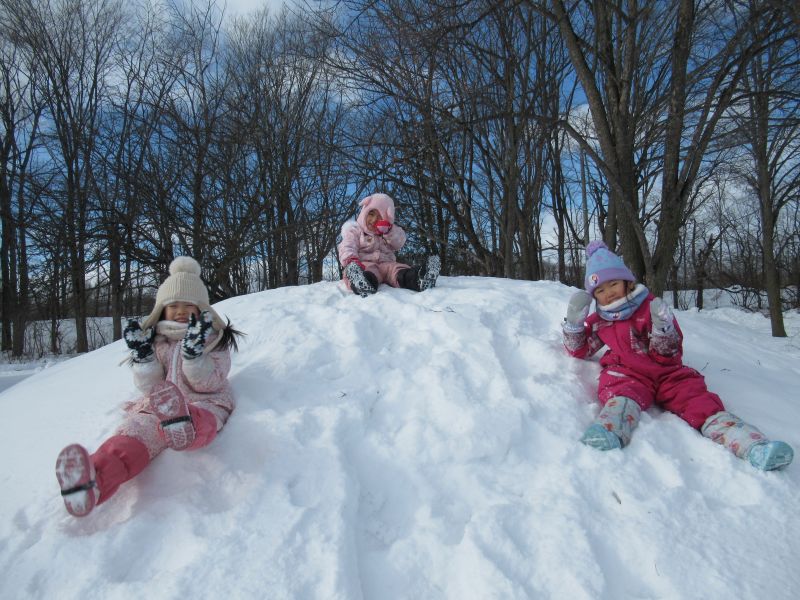 保育所裏に造られた雪山でそり遊びをしました。とても良い天気で寒さに負けず雪遊びができましたよ!バケツに雪を詰めて次の日にはこの雪がどうなっているのか実験しよう!と張り切って雪を沢山詰めている子ども達。しばらくしてからバケツをひっくり返すときれいな氷ができていて「出来た〜すご〜い」と大喜びでもう一度氷を作る!と雪集めに精を出していました。
