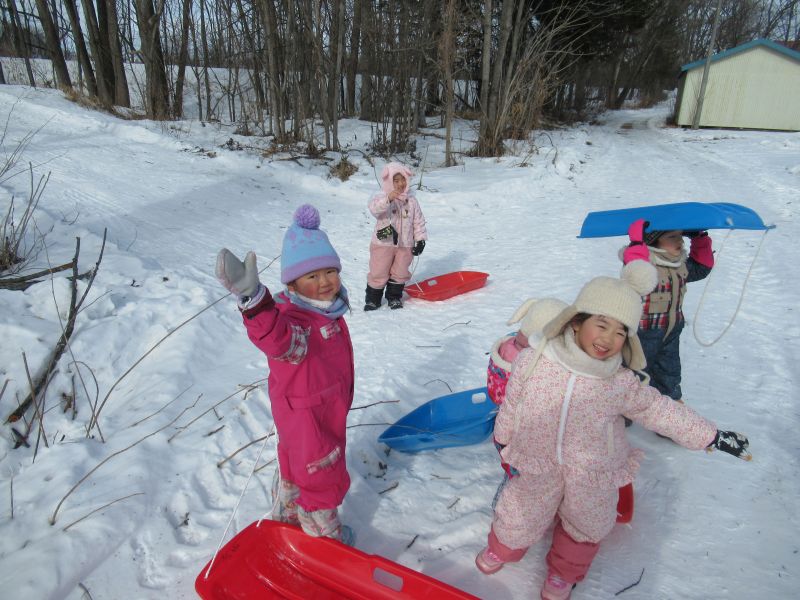2/3(火)節分のまめまき行事がありました。自分で作った鬼のお面をつけてスタンバイ。鬼退治ゲームをしている時に迫力満点の鬼の登場にびっくり!怖がりつつも勇気を出して、鬼に立ち向かい果敢にせめて豆を投げ続けていた子どもたち。鬼退治頑張りましたよ。しっかりと心の中の鬼も追い出すことができたようです。きっと福の神がたくさん保育所に来てくれることでしょう。天気のいい日は、そり滑り・色水を使った雪遊びなど冬の遊びを楽しんでいます。外遊びはみんな大好きです。自然の中で、おもいきり体を動かし体力作りをしていますよ。雪解けまでまだまだたくさん楽しみたいと思います。