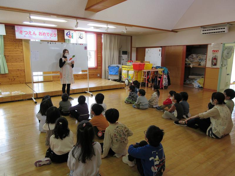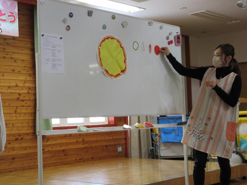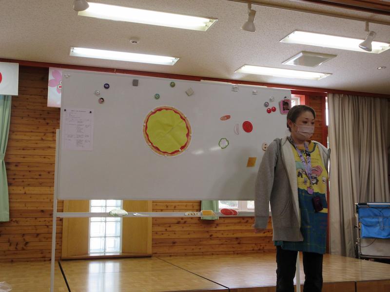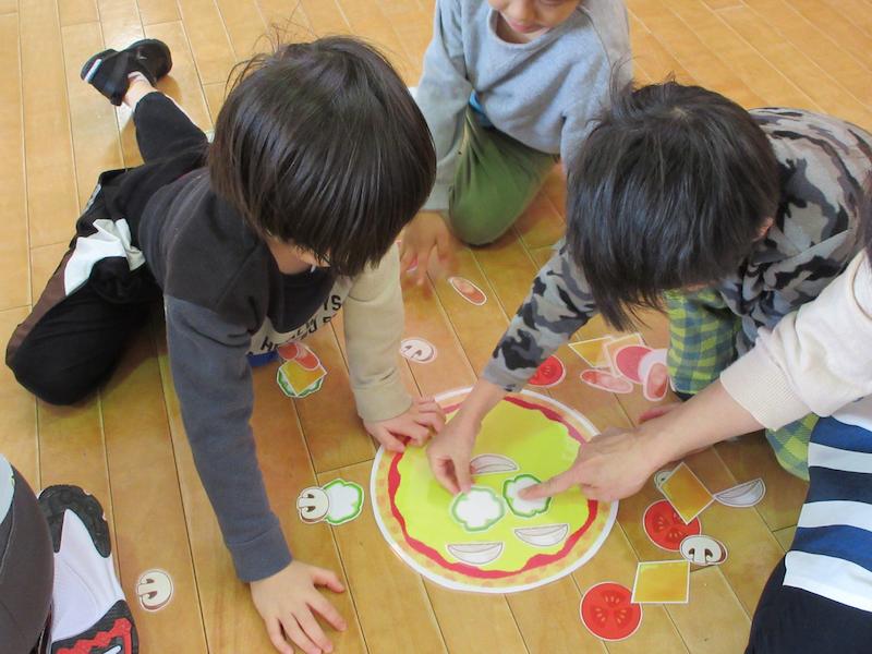 それから、先生が食べたいピザの具を英語で発表し、子どもたちがグループで言われた通りのピザを作る活動を行いました。英語をしっかりと聴き取り、みんなで力を合わせて美味しそうなピザを作る事が出来ましたよ♪ 最後はフルーツバスケット!「栄養満点!!」の掛け声で元気いっぱいに移動していました。今年度最後の食育活動に楽しく参加していた子どもたちでした!