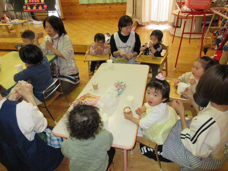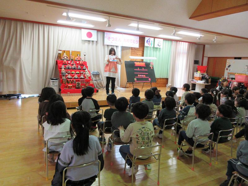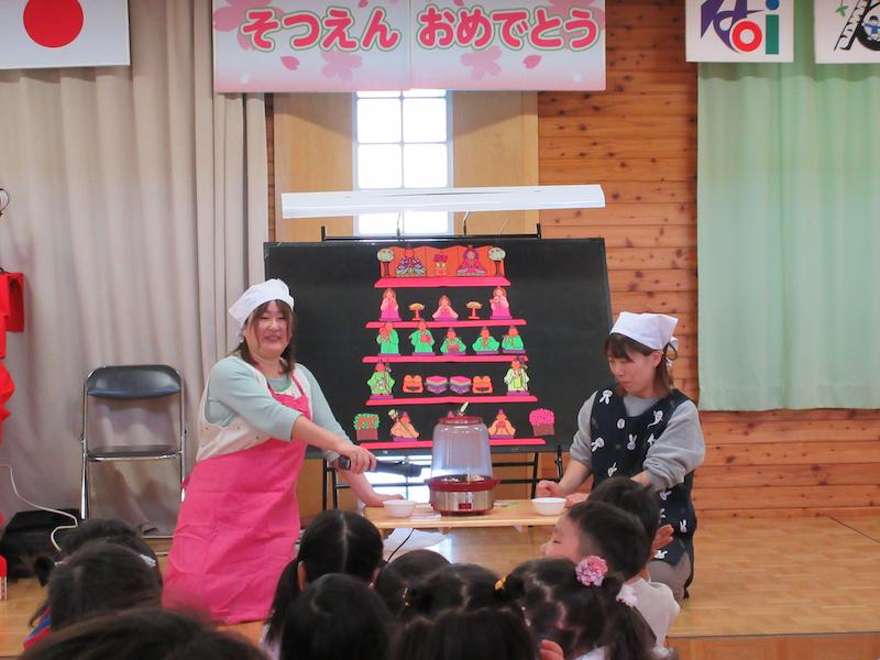 3月3日にひなまつりのお祝いをしました。最初に園長先生からの由来の話を聞いて、ブラックパネルシアターを見ながらみんなでひなまつりのおうたを歌いました。それからは、今年は特別に3分クッキング!