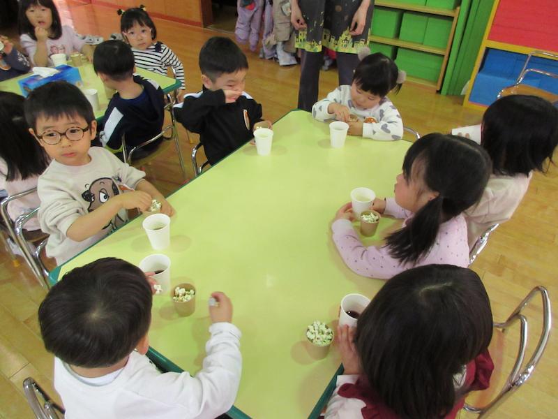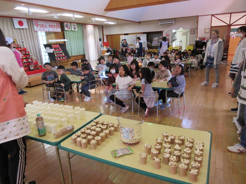 ポップコーンが弾ける様子を目をキラキラ輝かせて興味津々に見ていた子どもたち。「映画館の匂いがする〜」と待ちきれない様子でした(*^-^*) みんなで、ポップコーンとジュースを手にひなまつりをお祝いしましたよ。その後は、お遊戯場で会食をして特別な一日になりました♪