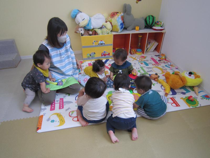 お部屋では、子供たち同士で遊ぶ姿も見られるようになってきました。なにやら同じことを真似っこしながら、笑い合っている姿は、見ていてとっても微笑ましいです。