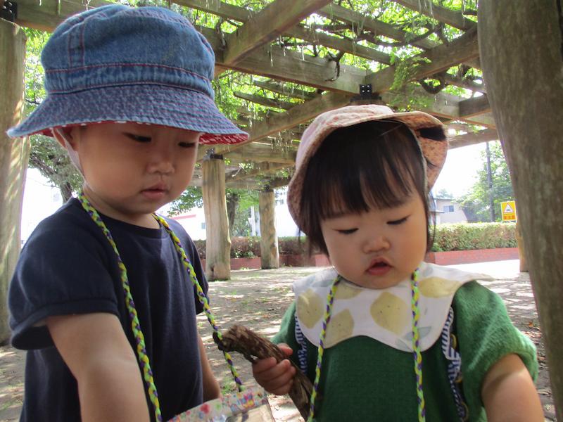 という様子で、たくさん探索し自分たちでお散歩バックにいれて持ち運んだり、宝物のように手で持っていたり様々でした。見つけた時は、「あった!」「これねえね(お姉ちゃん)