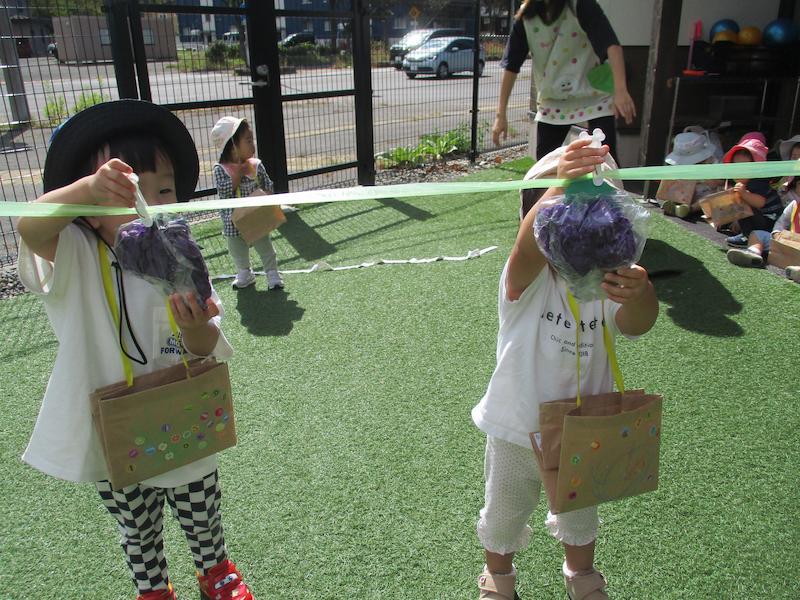 といっていたぶどう組のお友だち。そこで、次はお散歩バックを持ってお土産でもって