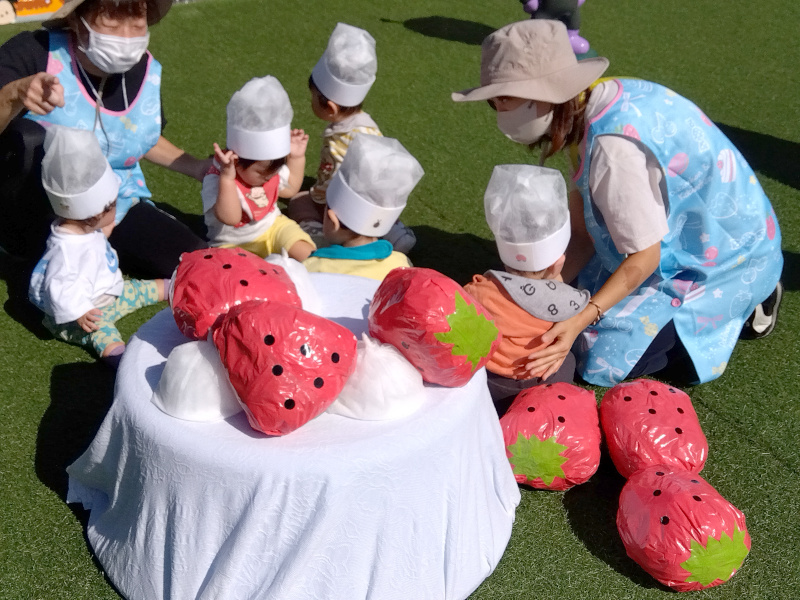 3日には運動会ごっこがあり、ばなな組さんは「いちごのケーキ召し上がれ」と題し、コックさんの帽子をかぶってケーキを作りました。本番ではいつもと違う雰囲気に少し緊張しながらも素敵なケーキができましたよ☆