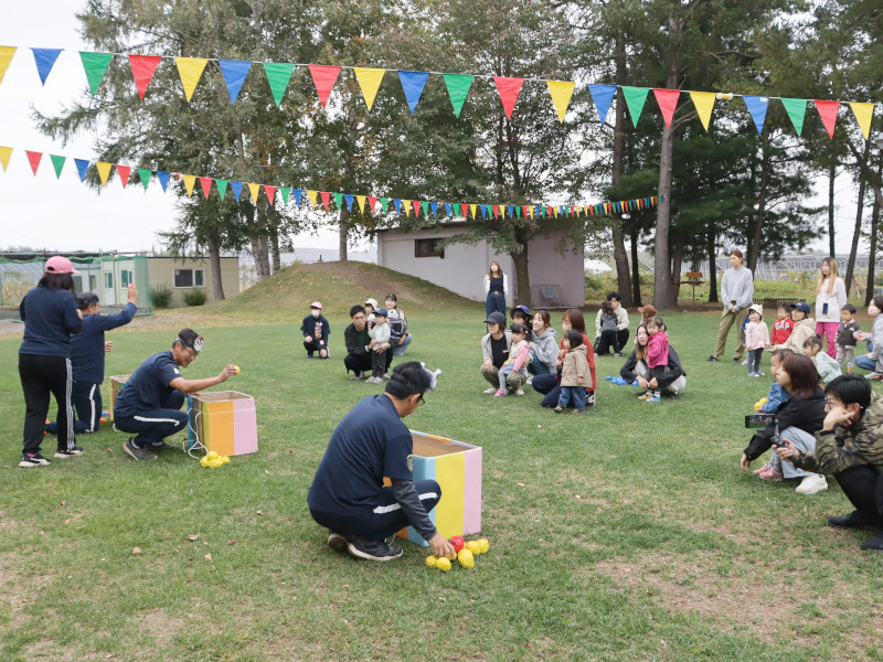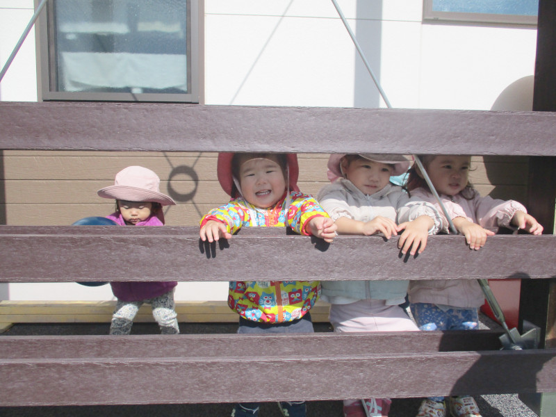 木々の色が変わり始め、地面に重なる落ち葉や木の実。季節はすっかり秋ですね。 先日、運動会ごっこを行いました。ぶどう組はフルーツ狩りを競技にしました。 クレヨンでお絵かきして作った世界に一つだけのオリジナルバッグを首にさげ、ぶどう、いちごを取ったり一本橋を渡りました。 本番は緊張の中、とっても頑張ったぶどう組です。 「今日外行く?」「散歩行くの?」とお外で遊ぶことが大好きな子供たち。 園庭では、柱に隠れてかくれんぼをしたり、ボール遊びやシャボン玉が出てくると追いかけることに夢中で、いつもこどもたちの大きな声が響いています。 これからもっと寒くなる日が続きますが、沢山外遊びを楽しんでいきたいと思います!!