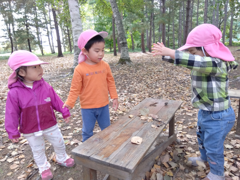 色づく木の葉に、地面に重なる落ち葉や木の実。季節はもうすっかり秋ですね。寒い日もありますが、子どもたちは元気いっぱい戸外遊びも室内遊びも楽しんでいますよ♪