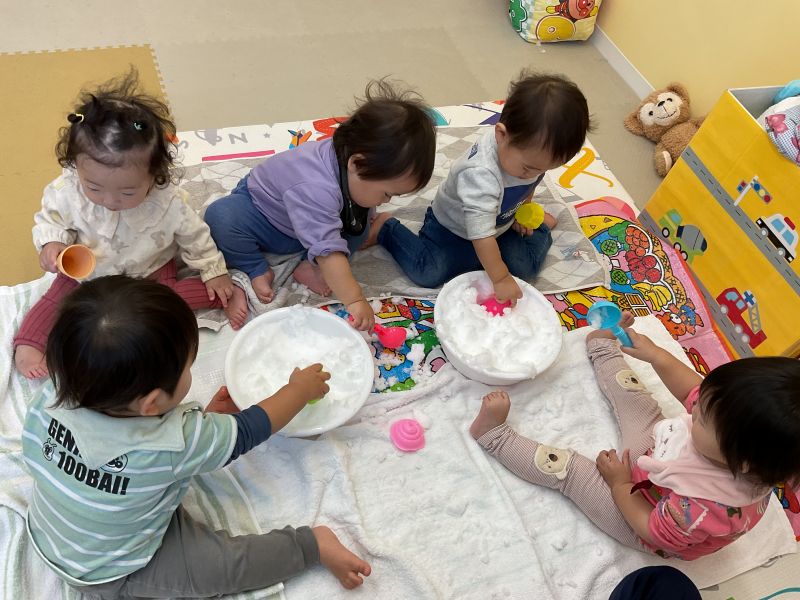 寒さがまたいちだんと厳しくなってきたこの頃。うんと冷える日もありますが、今年最後まで元気いっぱいに過ごしたいと思います。雪が降った日には、雪遊びをしました!初めての雪遊びはお部屋で。興味津々の子どもたちは、スプーンやカップを使ってザクザクと雪をすくったり、手に乗せてじーっと見てみたりしていましたよ。これから戸外で雪遊びをするのが楽しみです。寒さが厳しい日は、室内で風船あそびや廊下で走ったりして体を動かしています。風船あそびではギューっと握ってみたり、壁や服など色々な所にくっつけてみたりと発見しながらあそぶ子どもたちです。
