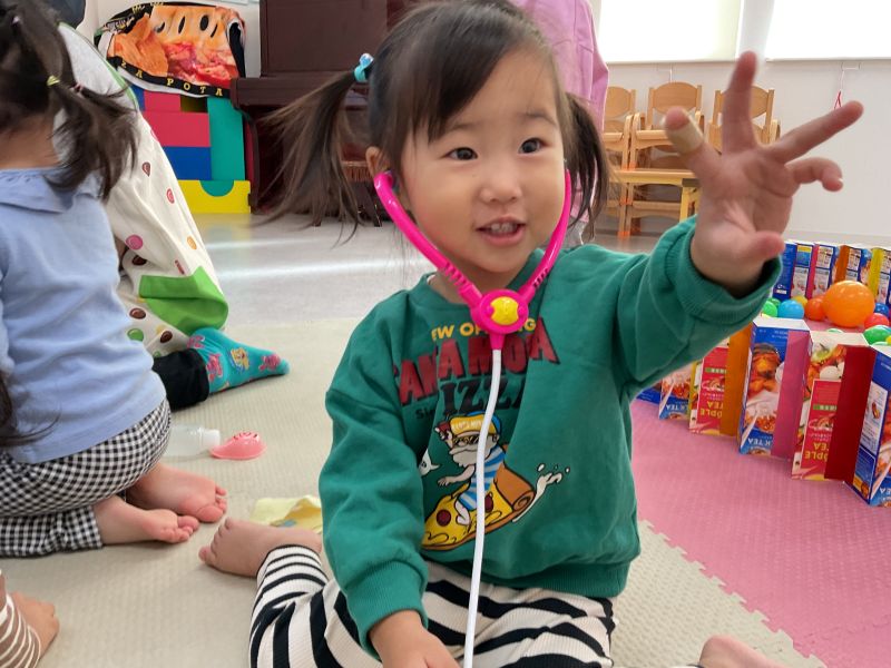 こどもたち一人ひとりが自分のペースで成長してきた一年を振りかえるこの頃。あっという間に年内最後のひと月になりました。ぶどう組では、最近お医者さんごっこにはまっています。聴診器で「もしもーし」と音を聞く真似をしたり「おくすりでーす」「おねつです」などおはなしをしながらすっかりお医者さんになりきって遊びを楽しんでいます。踊りを踊ることも大好きなぶどう組の子どもたち。特にお気に入りなのは、『からだ☆だんだん』と「ベイビーシャーク』です。音楽が流れるとわくわくが止まらない様子でニコニコになって踊りだします。音楽が終わると「もういっかい!!」「つぎはなに?」とリクエストが止まらなくなります。この日は3曲続けて踊り改めて子どもたちの体力に驚きました。これから雪が本格的に降る季節にもなったので、雪遊びもたくさん楽しんでいきたいと思います!
