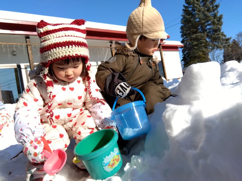 12月になりやっと雪が降り、子どもたちも大喜びです。大好きな雪が降ったので難しいつなぎや手袋を履いたりするのも頑張っています。「お家で(雪かき)お手伝いしたんだ〜」と報告していてとっても可愛らしいですよ。雪合戦をしたり、バケツを使ってケーキを作ったりと冬の遊びを全身使って楽しんでいます。12月の誕生会ではマラカスを作り、みんなで演奏会をしました。0歳児さんと1歳児さんのマラカスづくりのお手伝いをしてまるで小さな先生のようでした!子どもたちのマラカスと先生方のタンバリンや鈴の音でとっても楽しい演奏会になりましたよ。