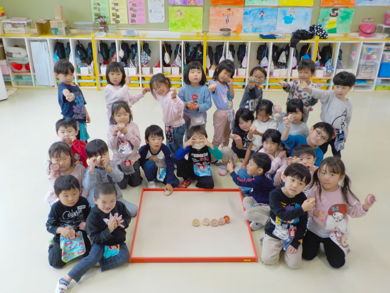 今月のもり組は,なわとびとけん玉の挑戦遊びに夢中になっています。なわとびは,連続10回を目標に頑張っていて,毎日練習するうちに5回10回20回…と回数を重ねていますよ!たくさん跳べるようになると,子どもたちも嬉しそうで,友達と競い合いながやっています!けん玉では,大皿や小皿など様々な技に挑戦する子どもたち。乗せることが出来ると,見ていた周りの友達も自分の事のように喜び拍手する姿がみられていますよ★★