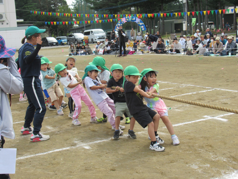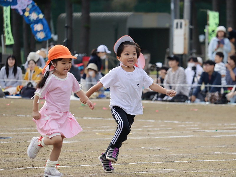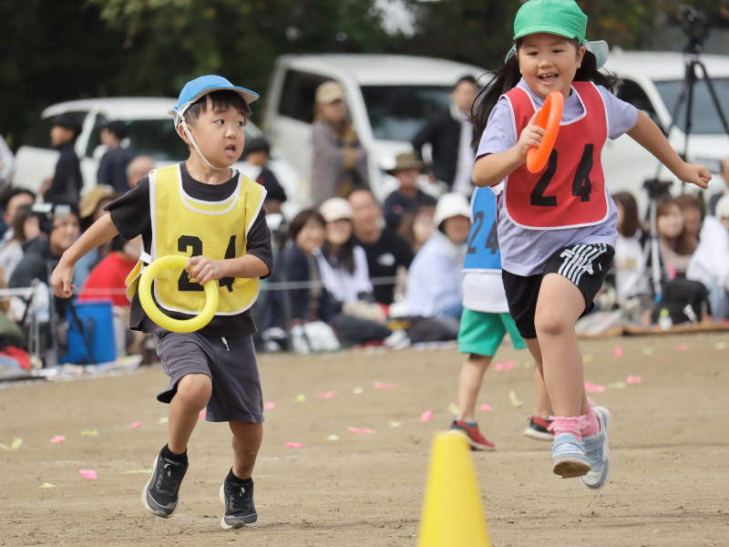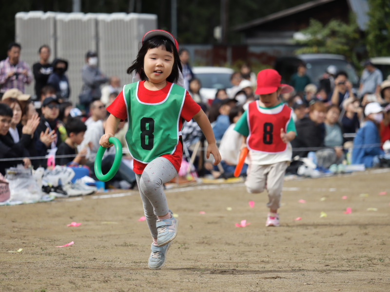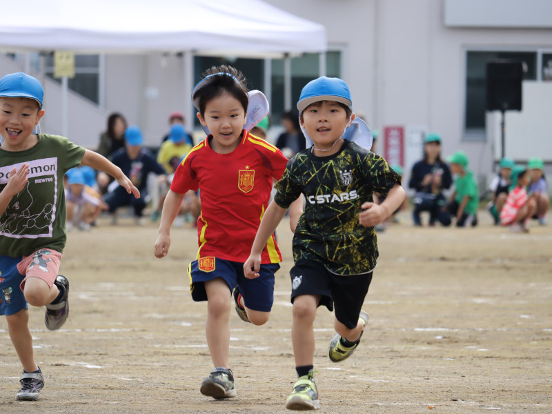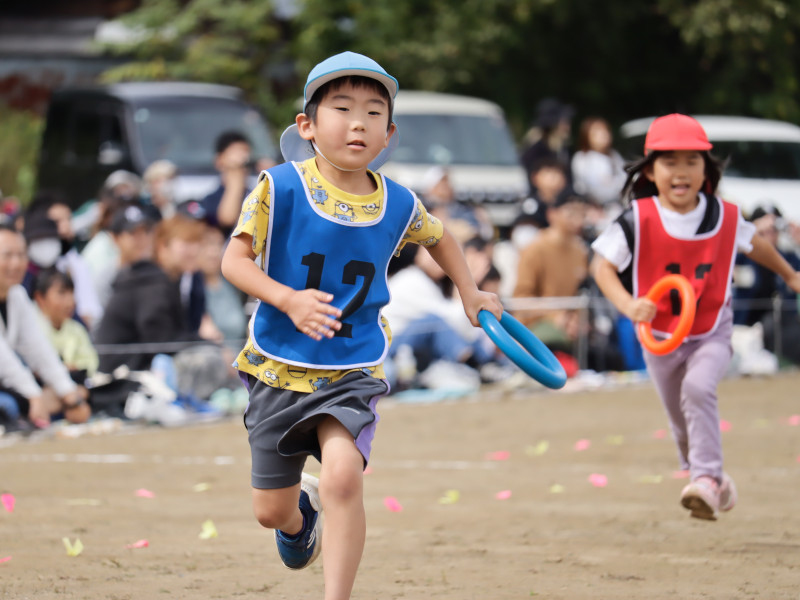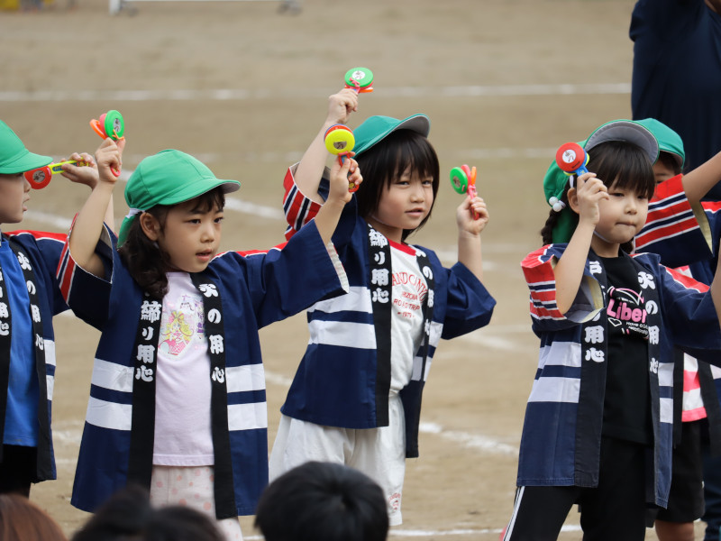 はじめて大勢のお客さんを目にした年少さんは少し不安な様子もありましたが,本番では素敵な笑顔を見せてくれました。年中さんははじめてのリレーに挑戦。クラスの絆がぐっと深まり,応援も一生懸命がんばりました。年長さんの竹登りは,自分の決めた目標にむかって,「あと少し」と手を伸ばし,最後まで諦めないでがんばる姿が胸を打ちました。 最終目標の鈴の音は嬉しそうに秋の空に響き渡りました。