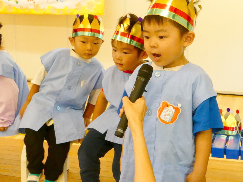 はじめに,誕生日を迎えたお友達は,ステージの上で,『組・名前・○歳になりました!』と発表し,将来の夢(年長)や好きな遊び(年中),好きな食べ物(年少)をお話ししてみんなからたくさん拍手をもらいました。