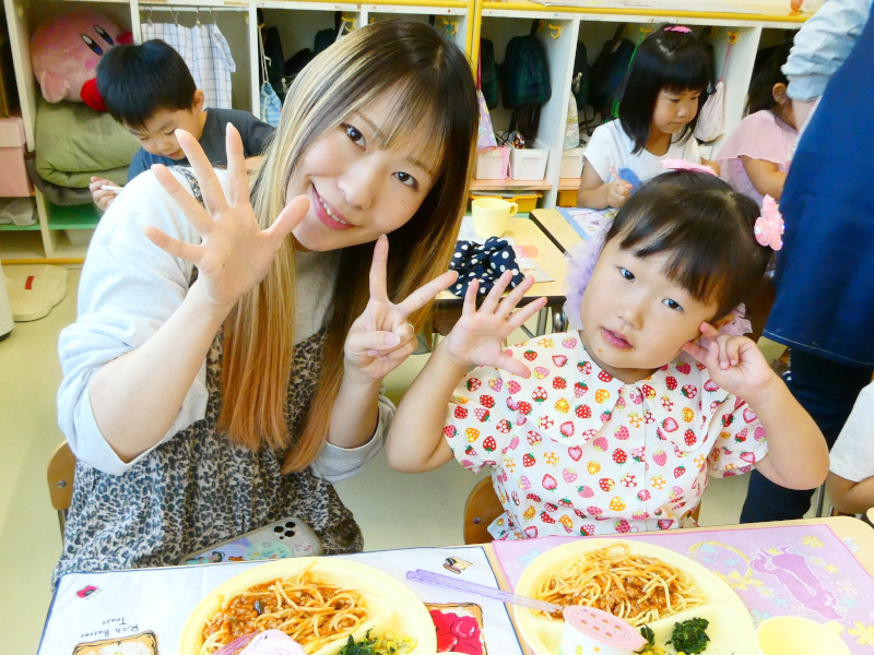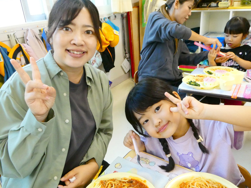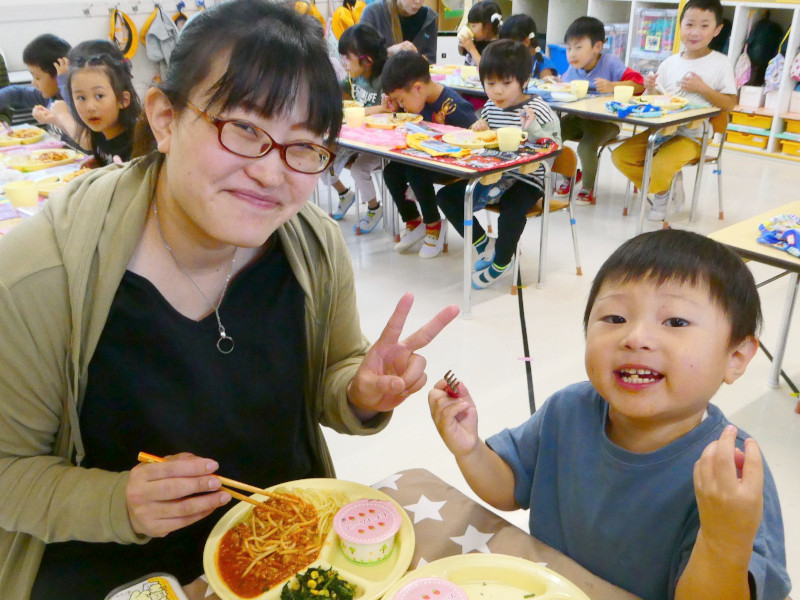 誕生会後は,9月生まれさんの給食試食会を行いました。「牛乳」「なすミートスパゲティ」「ほうれん草コーン炒め」「いちごムース」の栄養たっぷり,バランスばっちりな美味しい給食を親子で楽しみながら,和やかに誕生会&試食会は終了しました。