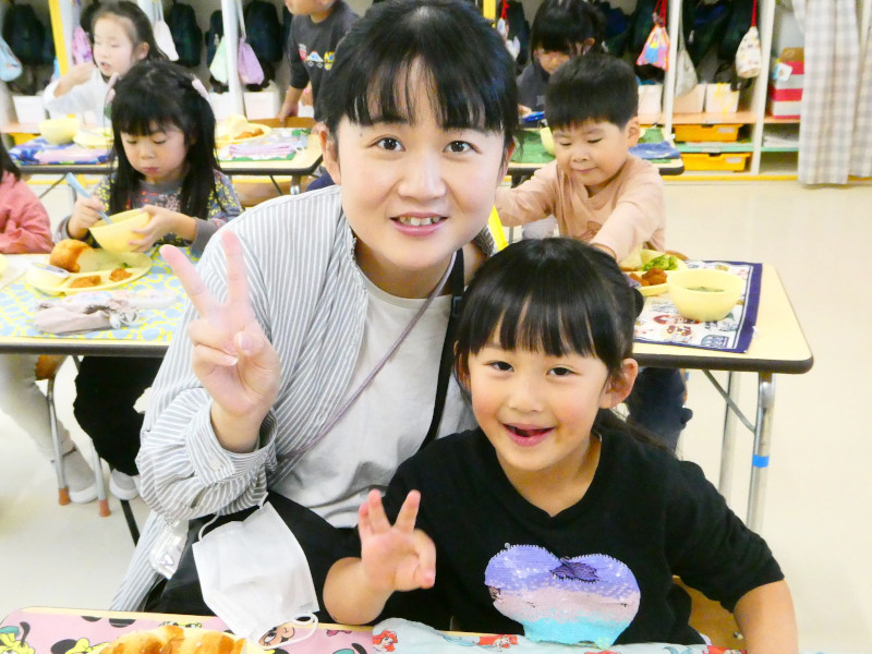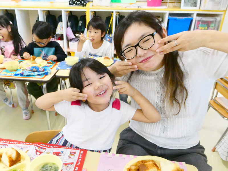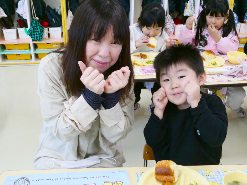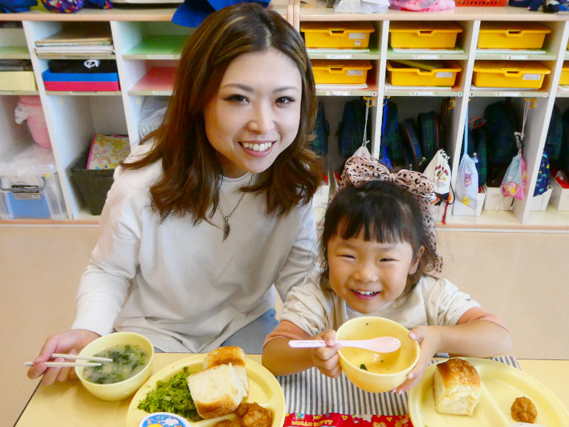 誕生会後は,10月生まれさんの給食試食会を行いました。「ベビーパン」「なすミートじゃがいもニョッキスープ」「唐揚げ」「ブロッコリーのしょうが和え」「十五夜デザート」の栄養たっぷり,バランスばっちりな美味しい給食を親子で楽しみながら,和やかに誕生会&試食会は終了しました。