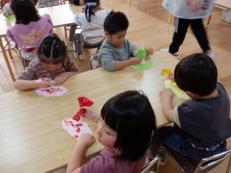明けましておめでとうございます。今年もよろしくお願いします!冬休み中の楽しかったお話を沢山聞かせてくれた子ども達。先日は、節分製作として鬼のお面を作りました!!まずはハサミで角を2つ切りました。紙の向きを変えながらスイスイと三角形を切ることができましたよ。その後は、絵の具とボンドを袋に入れてもみもみと混ぜました!そして、ホイップのように絞り、鬼の髪の毛を作りました!初めての感覚に「すごーい」と大喜びの年少さんでした。可愛い鬼が完成しましたよ。