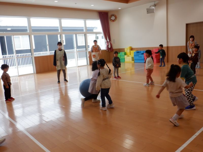 明けましておめでとうございます。今年もよろしくお願いします!年末年始のお休みや冬休みが明け、元気いっぱい登園してくれたみんな。お休み中の事を沢山お話してくれたり、背も大きくなり、なんだかお兄さんお姉さんになっているように感じましたよ。先日は、転がしドッジと中ぶつけを行いました。全力でボールから逃げるこども達。「またやりたーい」とやる気満々ですよ。ここ最近は年長年中さんに混ざり、ドッジボールも楽しみ始めていますよ。