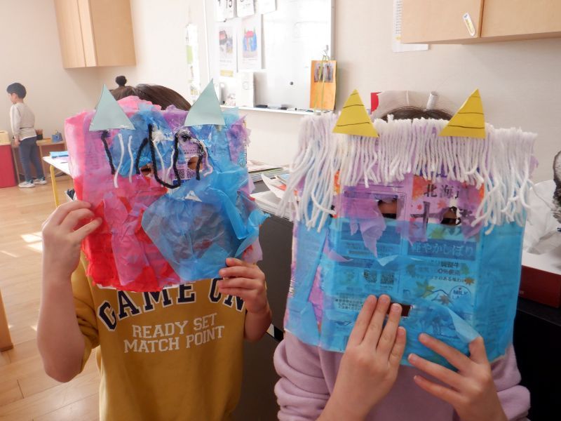 明けましておめでとうございます。今年もよろしくお願いします!年が明け、園生活も残り2か月となり、子ども達にとって「最後」ということが増えてきて、卒園が近づいていることをひしひしと感じていますよ。先日、鬼のお面を製作しました。牛乳パックで目や口を出すところに穴をあけ、花瓶やケイト、画用紙で髪の毛、角をつけましたよ!「これで鬼退治するぞ!」と一人一人個性あふれる素敵なお面が完成しました!鬼が来るのを、ドキドキしながら待ちわびているぞう組です。