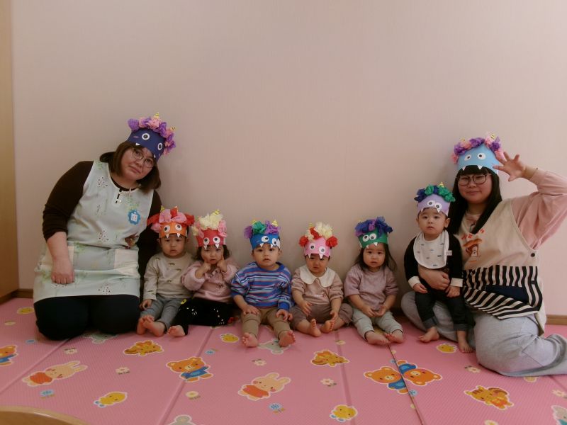 こんにちは!ひよこ組です(^^)今年度も残りあと2か月を切りましたね。1日1日を大切に、ひよこさんでの生活も思い切り楽しんで過ごしたいと思います! さて、2月3日「園内節分」がありました。自分達で作ったお面を付けてお集まりをしました。なんとこども園にも鬼が…!沢山泣きながらも、前日に練習した豆まきを思いだし、一生懸命豆まきしている姿がとても可愛らしかったです(^^)