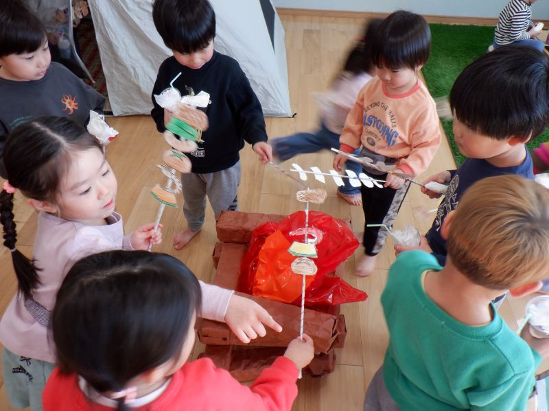 こんにちは!こあら組です。先日、きりん組とキャンプごっこを行いました!制作活動から一緒に行い、おにぎり・ジュース・バーベキューを用意しました(^^)当日は交代でお買い物ごっこをし、キャンプの食材をゲットしてキャンプ場へ!テントの中へ入って寝てみたり、椅子に座ってジュースを飲んだり、焚火でバーベキューを楽しみましたよ。お兄さんお姉さんに優しく教えてもらい、とっても嬉しそうな年少さんなのでした(^^)