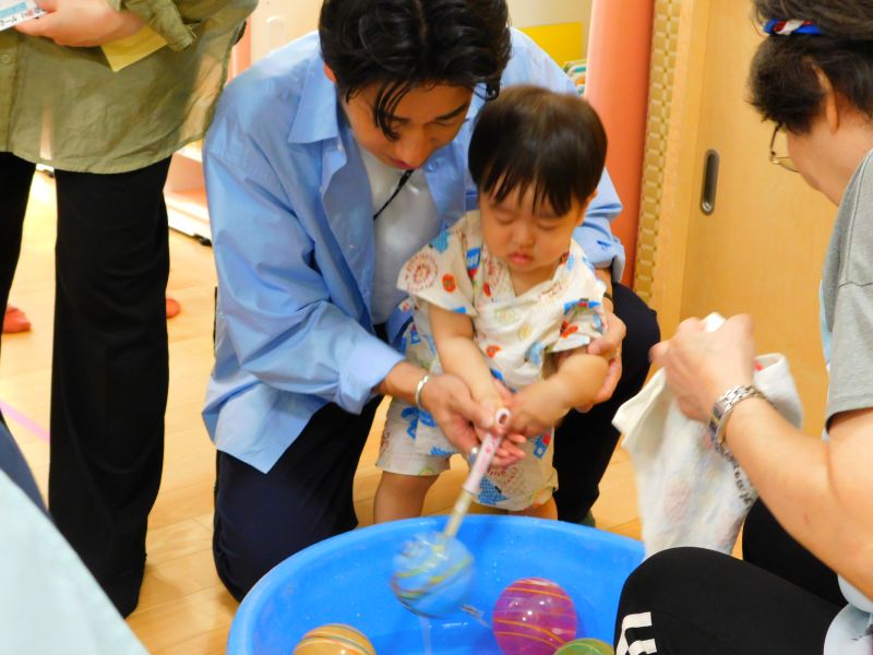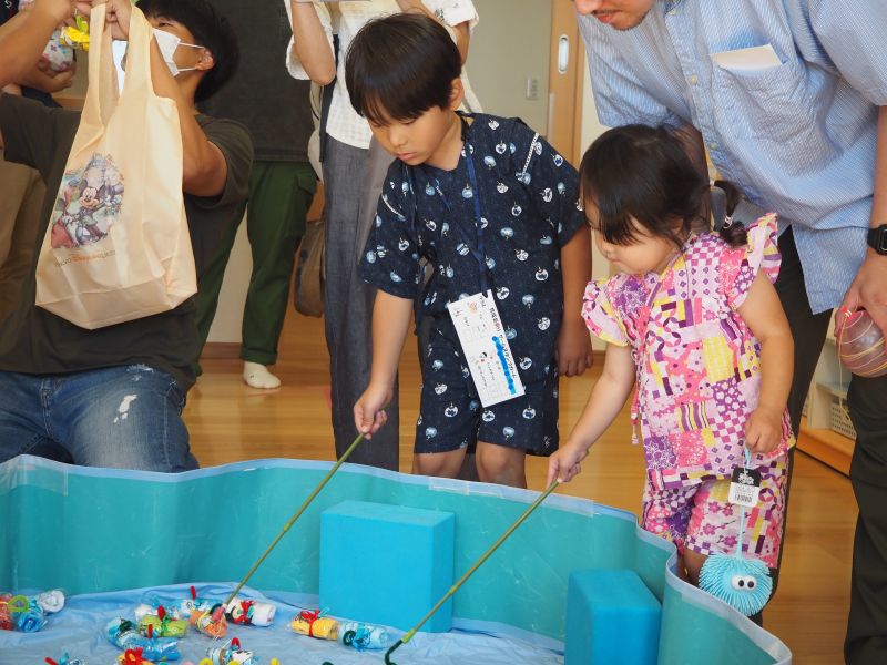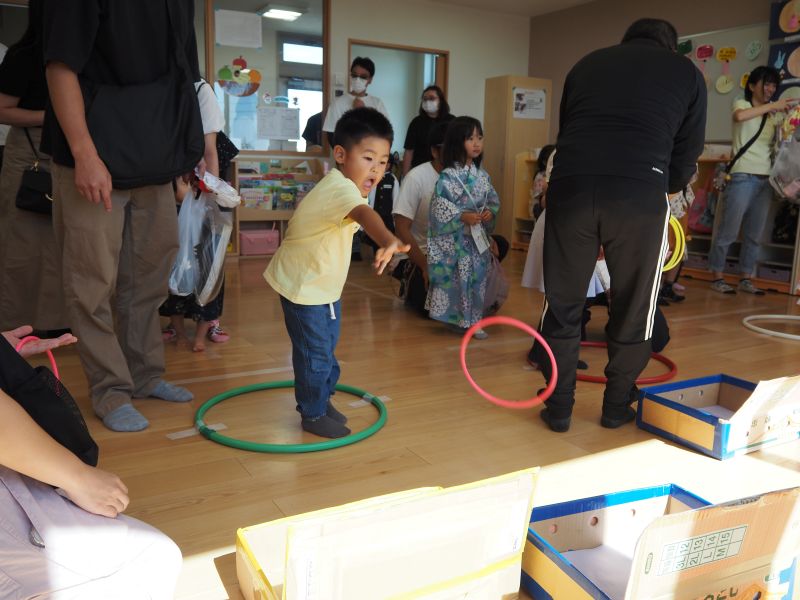 園舎内へ移動して催し物のブースを親子で楽しみました。いつもとは違うこども園のお祭りの雰囲気に笑顔いっぱい!お家の方やお友だちと飲み物を飲んだり、おにぎりを食べたり、あちこちでかわいい笑顔がたくさん見られました。