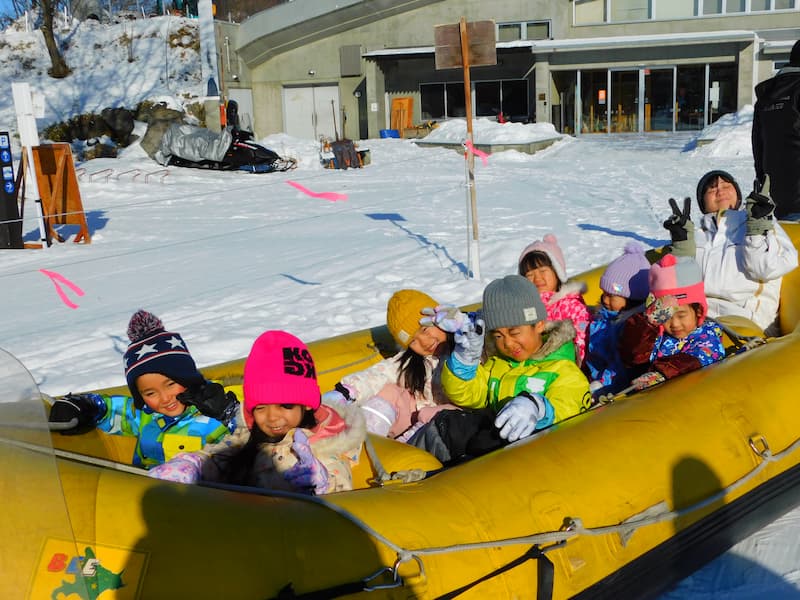 1月20日(火)は年長組、22日(木)は年中組、23日(金)は年少組が、十勝エコロジーパークへ出かけ、スノーラフティングを体験しました。ゴム製の大きなラフトボートに乗り、スノーモービルに引かれて雪原を進むと、風を切る気持ちよさに子どもたちの笑顔がはじけていました。ラフティングのあとは、エコロジーパーク内のそり滑りを満喫しました。(年少組は「宝来中央公園」に移動し、貸し切りのお山で思いきりそり遊びを楽しみました。)昨年度は天候の影響で実施できなかった分まで、子どもたちは全身で冬の遊びを味わっていました。