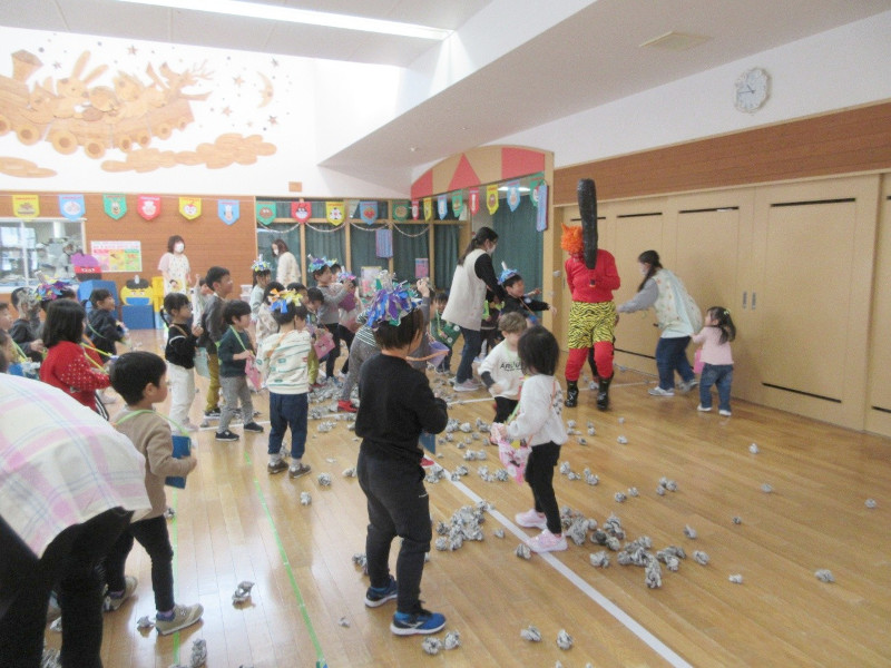実はコレ、鬼に豆をぶつける練習だったのですが、ゲームを楽しんでいるうちに「鬼」が登場!ゲームの通り鬼に向かって新聞紙豆をぶつける子もいれば、怖くて先生の後ろに隠れてしまう子もいましたが、なんとかみんなの力でやっつけて鬼は降参。鬼からお宝を貰って大喜びの子ども達でした!
