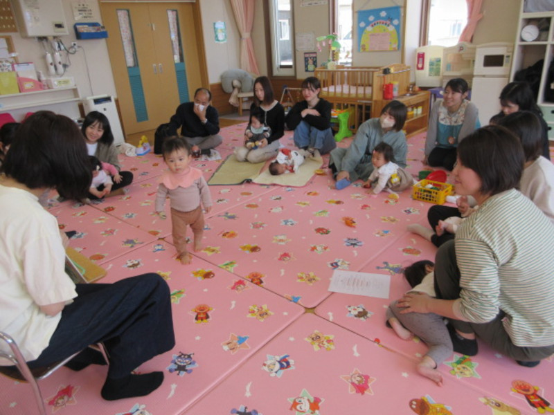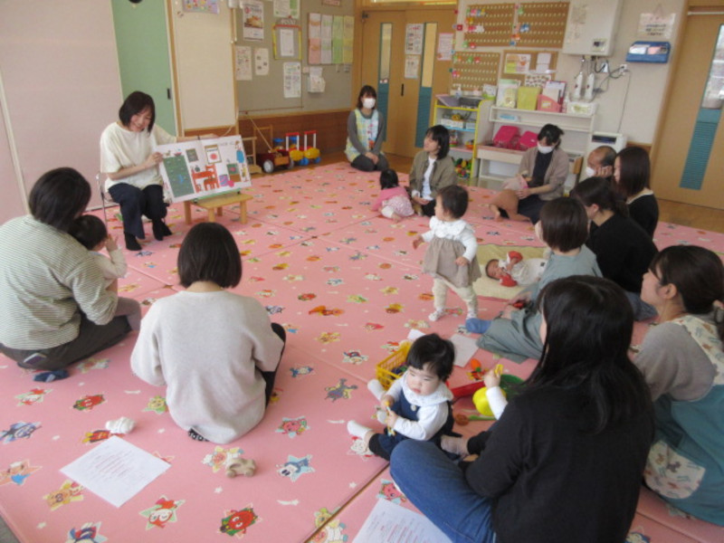 この日は、大谷短期大学附属図書館司書・絵本専門士の水野有子先生にお越しいただき絵本の魅力をたっぷり教えてもらいましたよ。 しつけや教育のためでなく心を豊かにするもの。人生で最初に出会う芸術・音・色・言葉の世界。など、講話を聴きいたあとは、実際に読み聞かせをしてもらい、「この絵本には作者のこんなねらいやしかけがあるんだよ・・・!」と、教えてもらいママたちも新しい発見の連続で楽しい時間でした☆