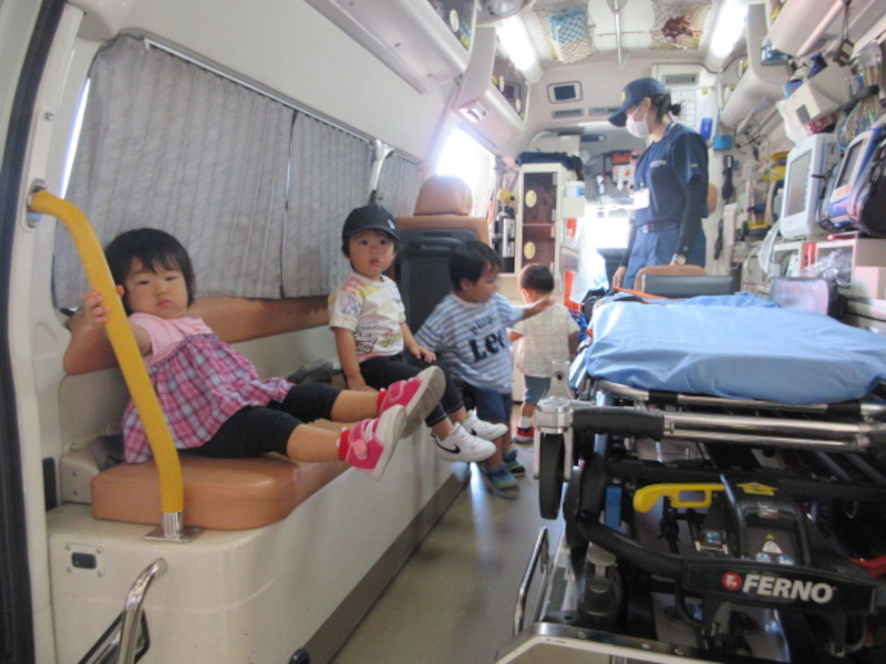 毎年大人気の消防署見学!今年は気候もちょうどよく、快適に見学することができました。始まる前から、消防車や救急車に乗りたい・触りたいと、わくわくする子供たち…いざ始まると、積極的に救急車の中に乗り込み、ベッドに寝転がってみたり、普段できない貴重な体験をさせてもらいました。